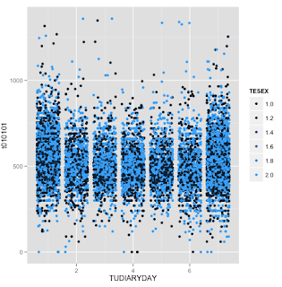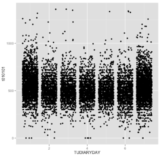 The X-axis represents days of the week, Sunday = 1 and Saturday = 7. Along the Y-axis is t010101, the variable for ‘time sleeping’, and it is expressed in the form of minutes. This is what I see when I first crack open some data. It’s raw.