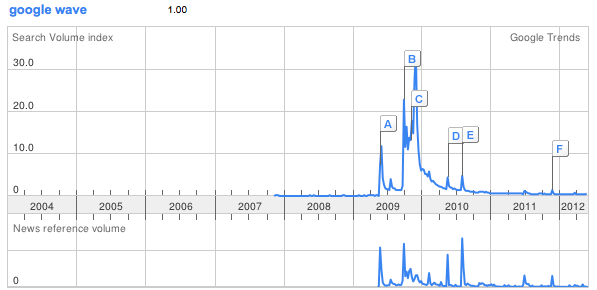 Google Wave – such massive growth in late 2009 – then a very rapid death.
